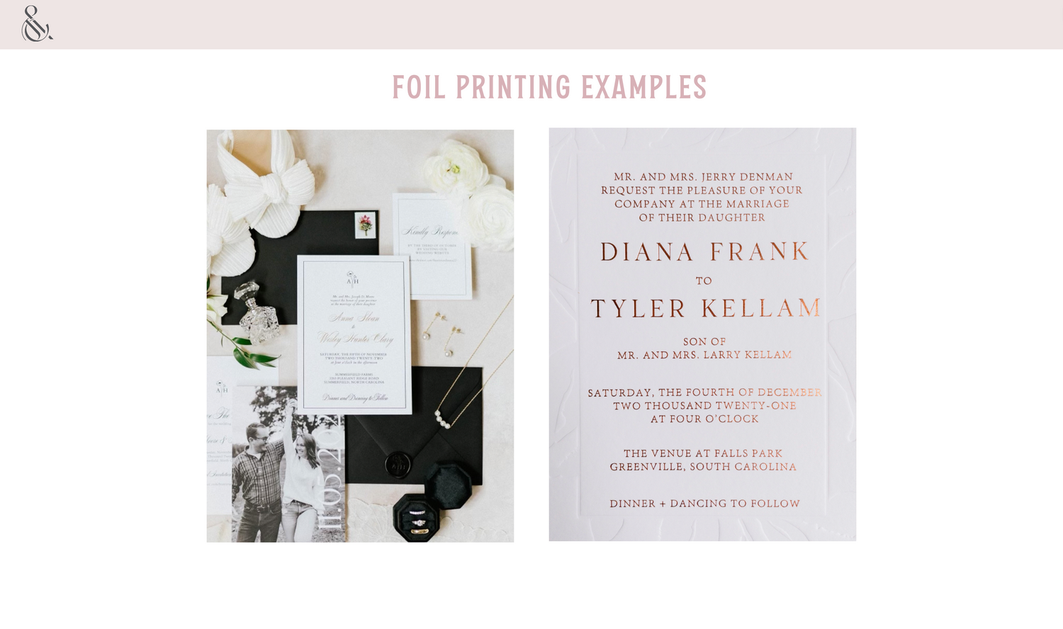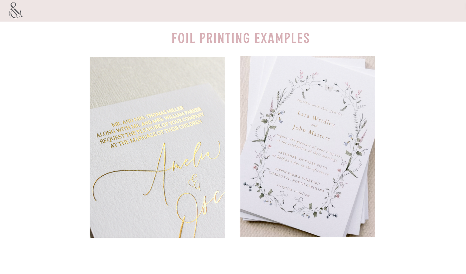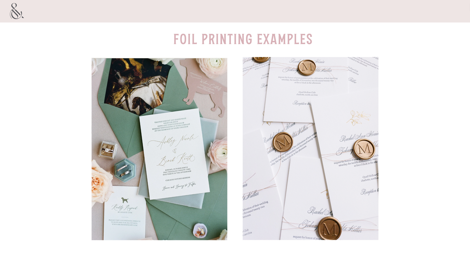 Our foil prints use a hot foil stamping method. Foil printing uses a similair process to letterpress but instead of ink a metallic foil sheet is used. It adds a beautiful shine to any suite. Printing your invitations with us ensures the best quality and most accurate colors as we will convert your files properly to print on a CMYK printer (if pairing with digital printing). Sample packs available here.